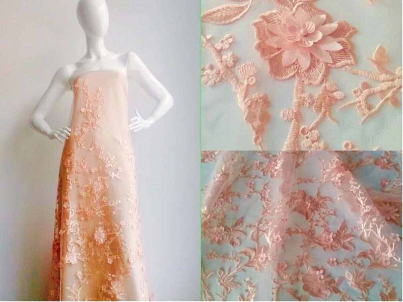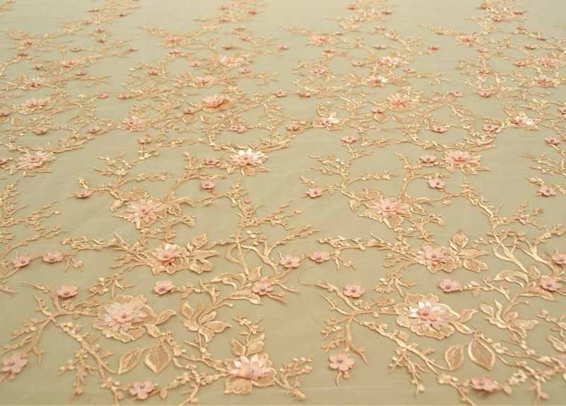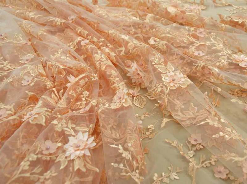 Тонке Мереживо, прикрашене об’ємними елементами з ефектом 3D та розшити перлами. Продається на метраж.