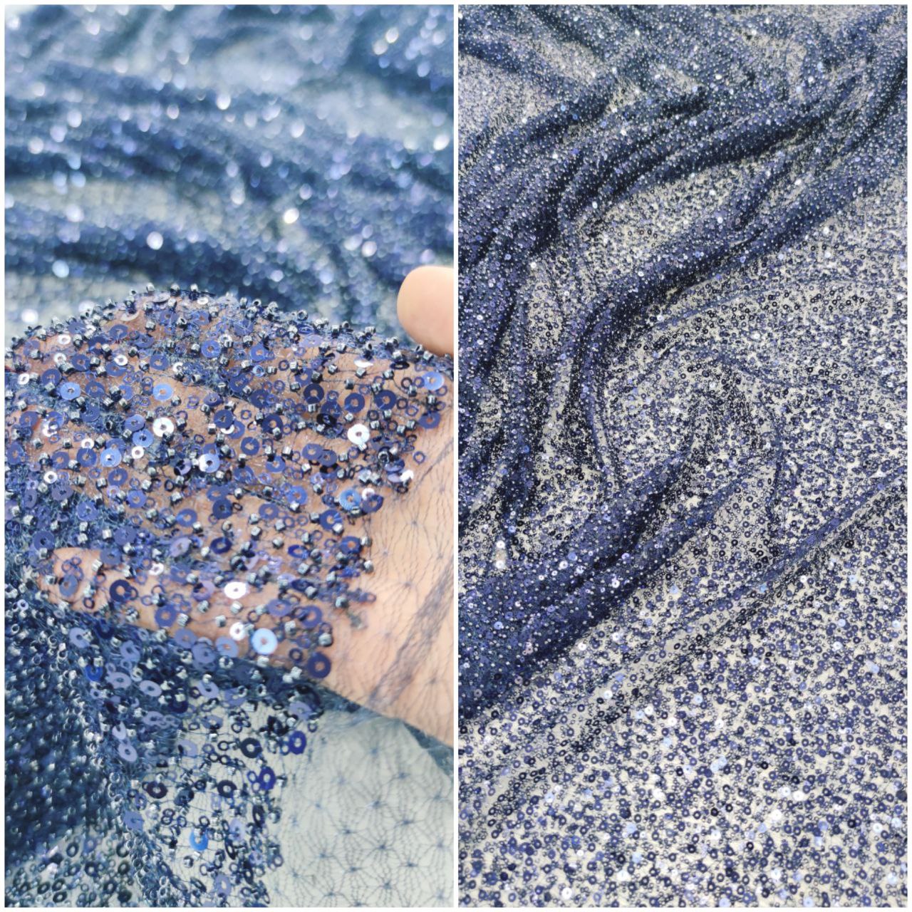 Тонке мереживо в синьому кольорі, розшите бісером та паєткою. Продається на метраж