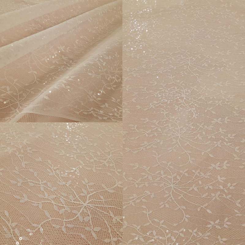 Легке плетене Мереживо-Шантільї з ніжним малюнком та паєткою на м’якій сітці, молочного кольору, Продається на метраж.