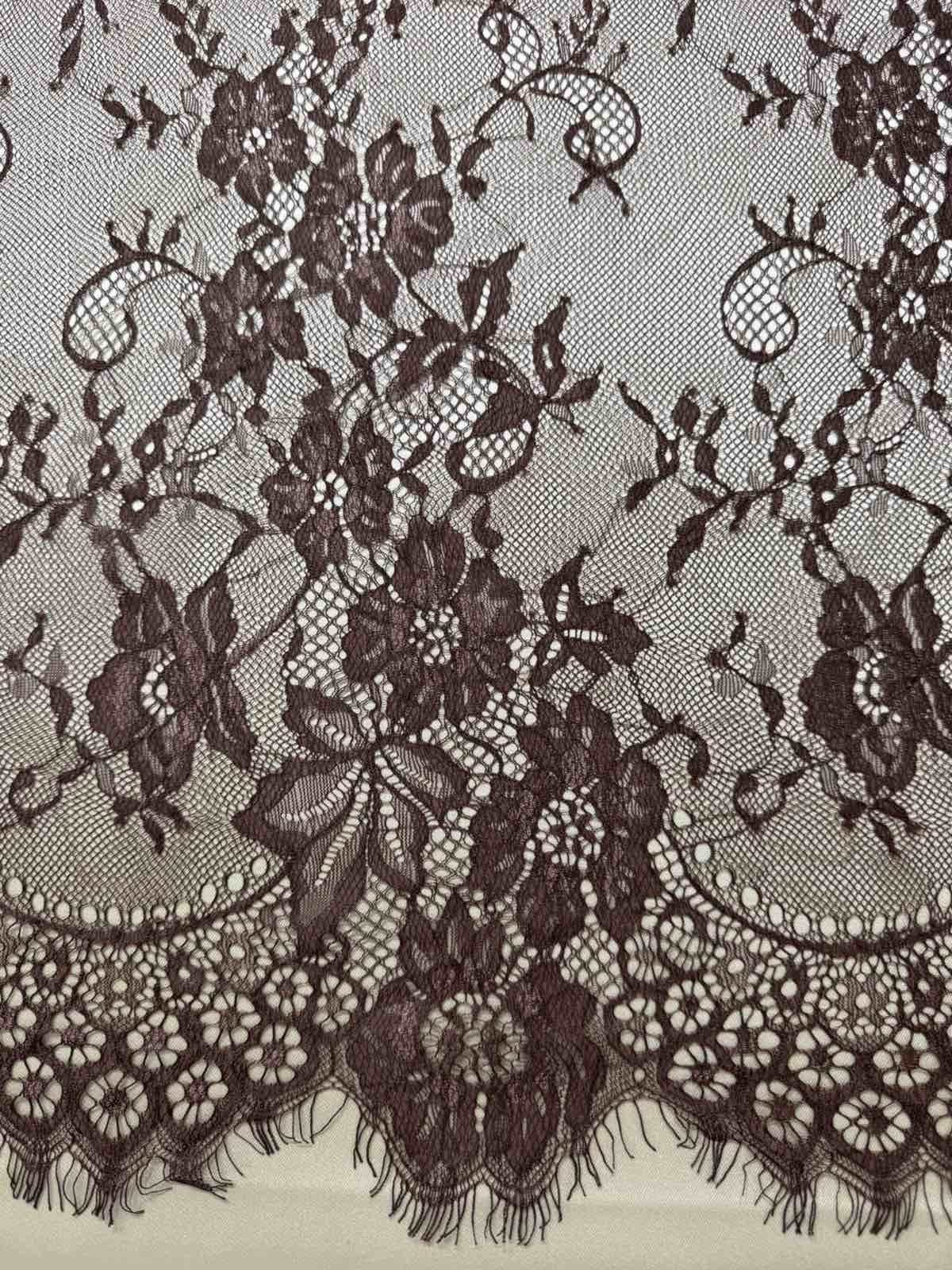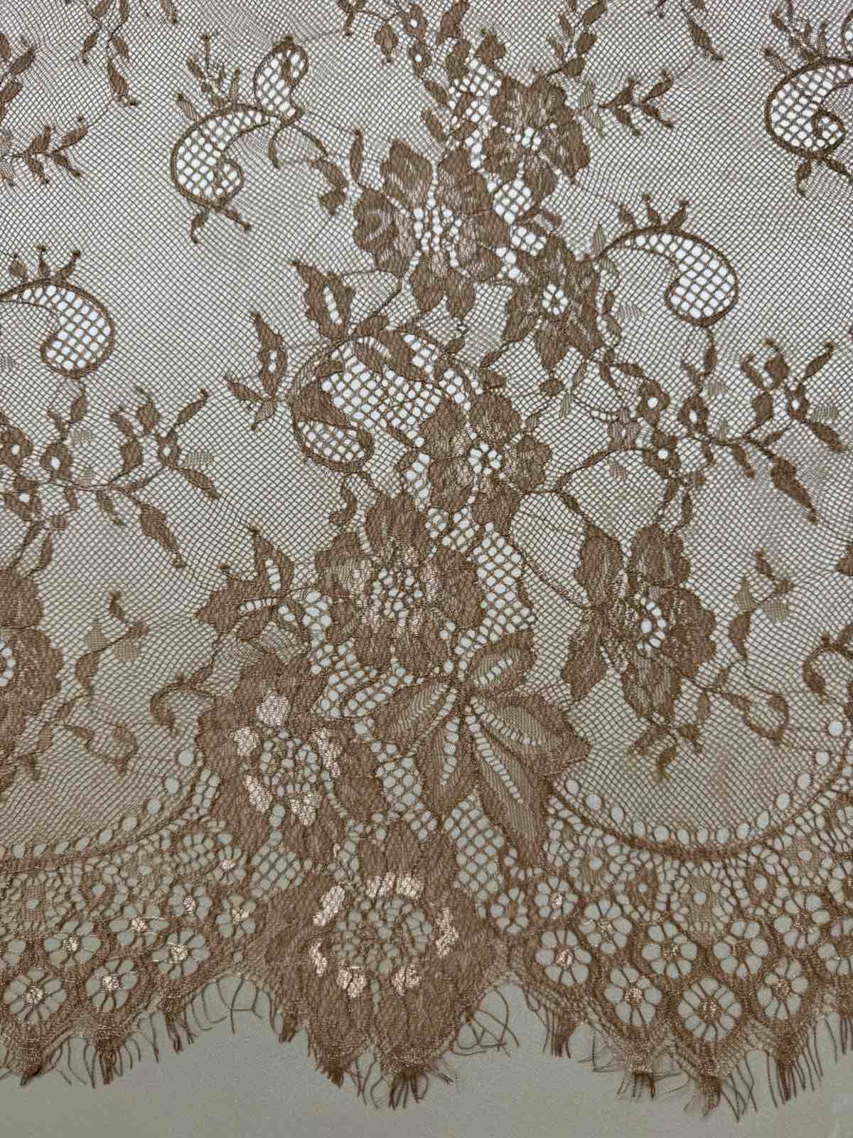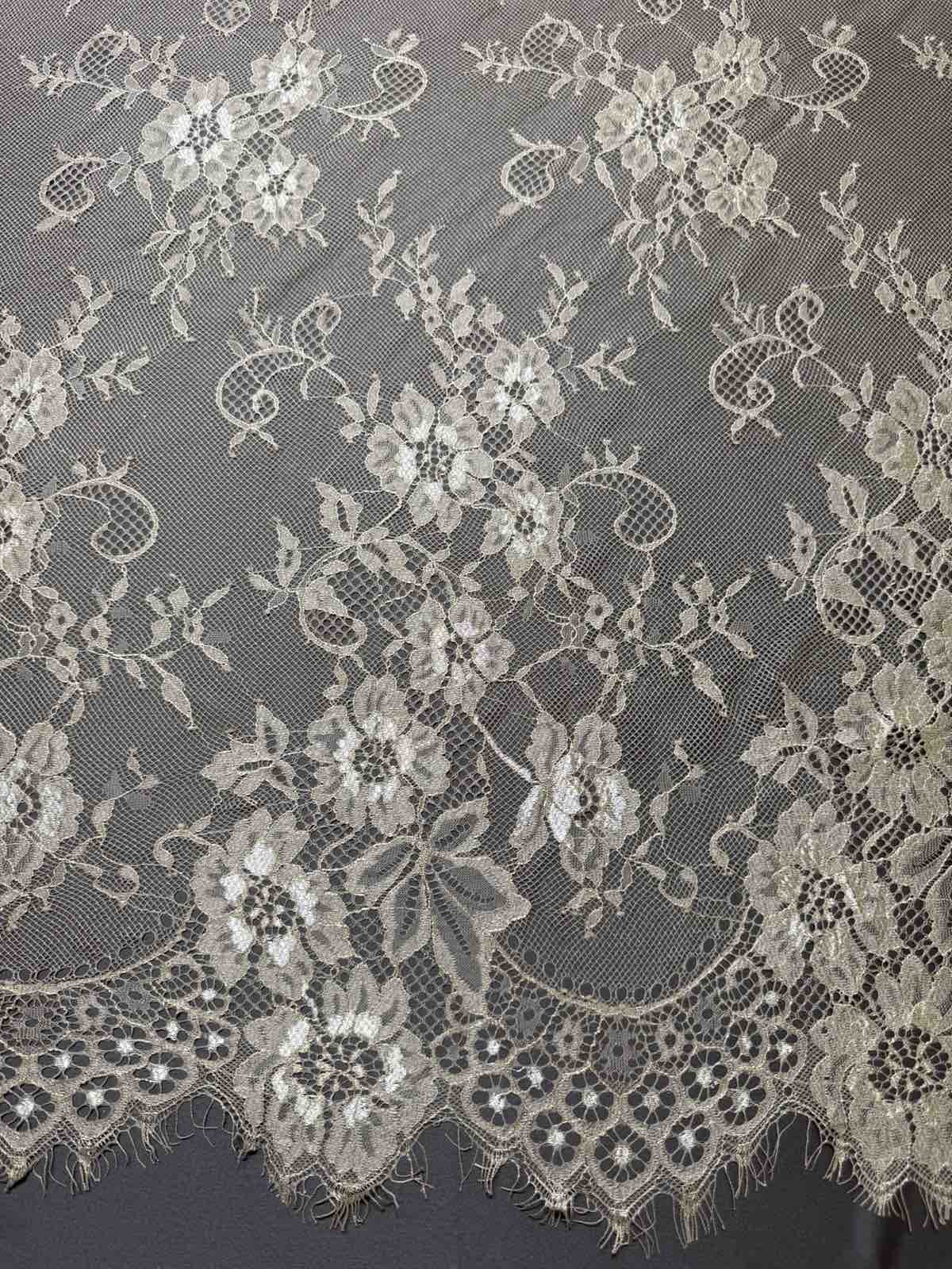 Це мереживо шантильї (Chantilly lace) — надзвичайно витончене та розкішне мереживо, відоме своєю тонкою сітчастою основою та делікатним візерунком з квітів і листя.