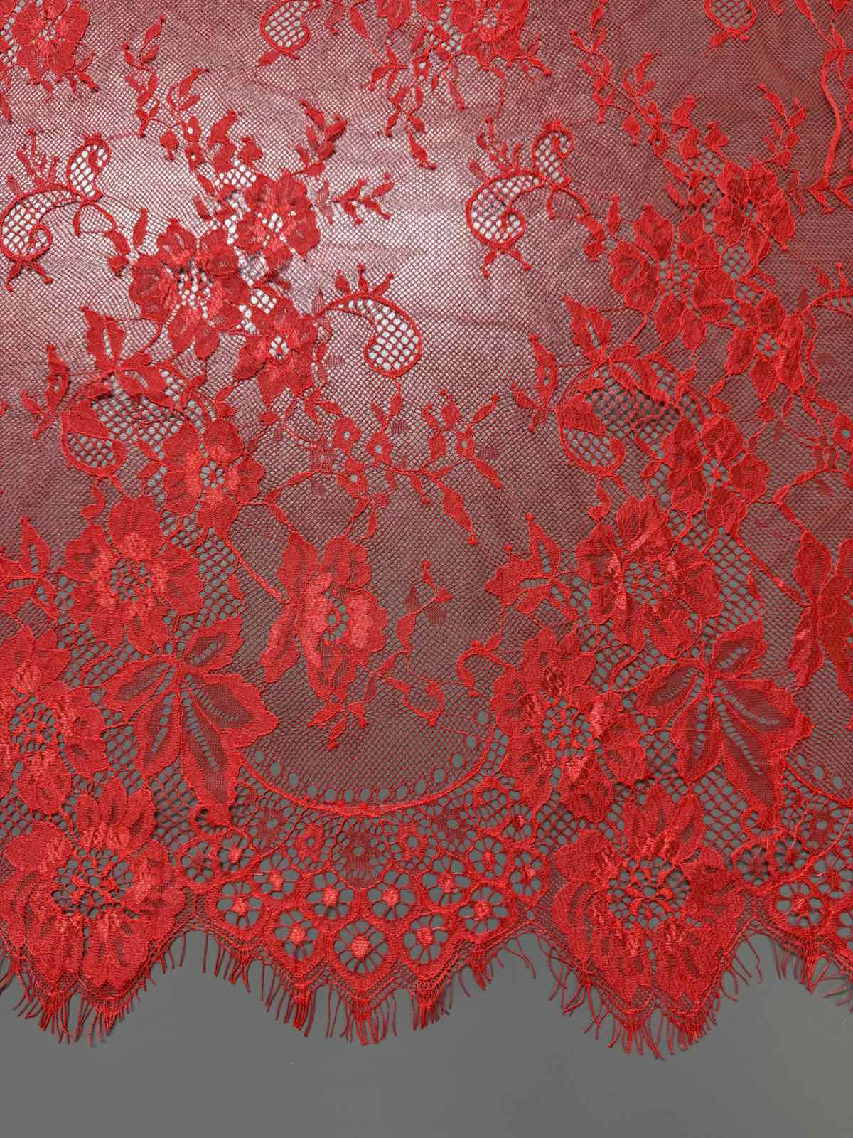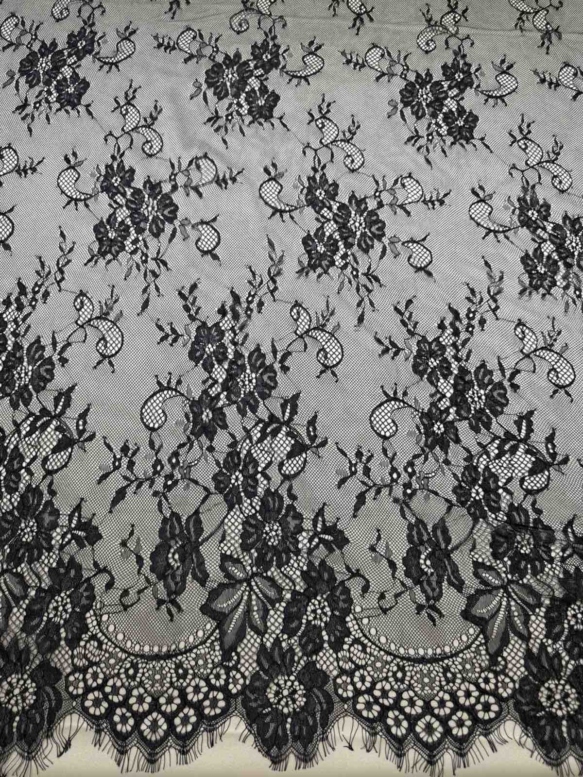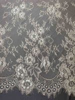 Представлене мереживо — шантильї з витонченим квітковим орнаментом і фестонним краєм. Візерунок виконаний щільною вишивкою на прозорій сітці, що створює ефект легкості та глибини.