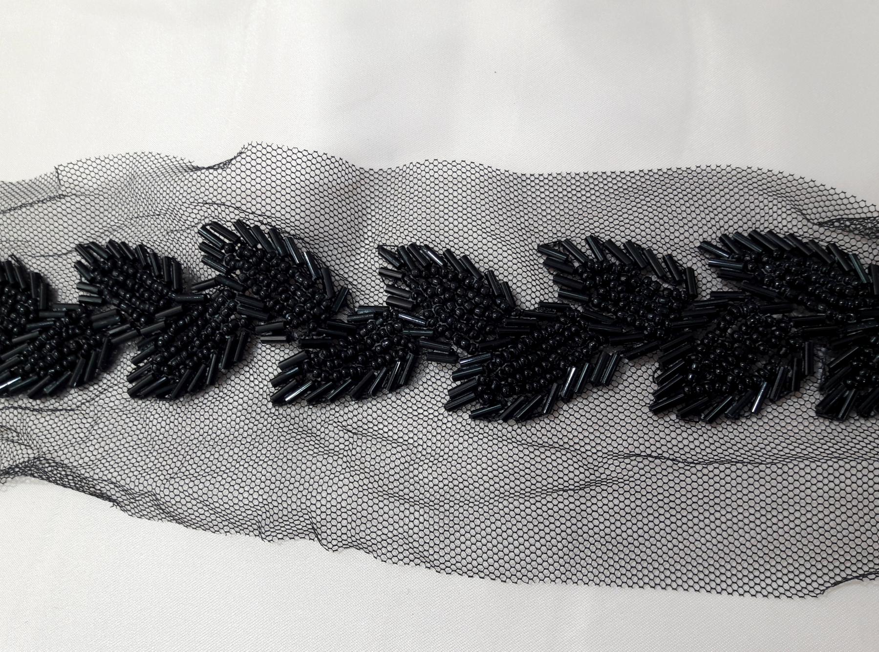 Вузька тасьма чорного кольору на сітці, розшита Бісіром, використовується для декорування та оздоблення виробів.